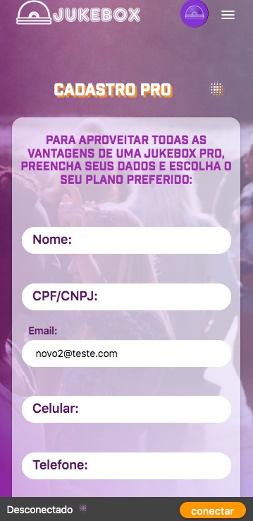Dentro do painel de controle de sua Jukebox, em CONFIGURAÇÕES mude sua Jukebox para a opção PRO, você será levado para o CADASTRO PRO.
