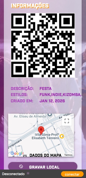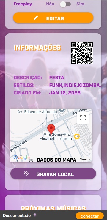 Para que seus convidados localizem sua Jukebox, em INFORMAÇÕES clique em GRAVAR LOCAL, isso manterá sua Jukebox detectável dentro de um raio de 50 metros. Se preferir, clique sobre o QR Code para seus convidados lerem com as câmeras de seus celulares. Você também pode imprimir e deixar o QR Code disponível no local.