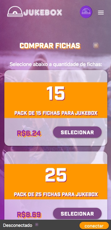 Se o local exigir fichas, vá em COMPRAR FICHAS. Escolha o pacote e realize o pagamento via Pix. Em instantes o total de fichas estará disponível em sua conta e o saldo aparecerá na página principal do app. Os créditos poderão ser usados em qualquer Jukebox paga.