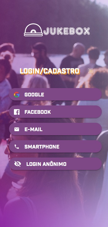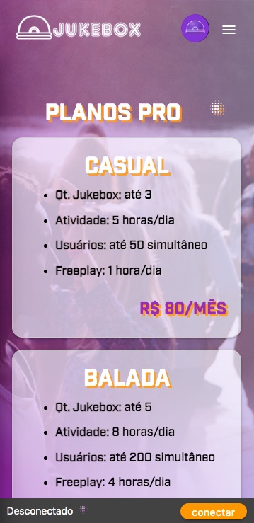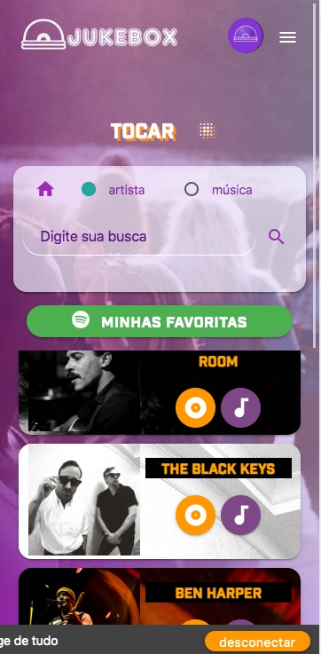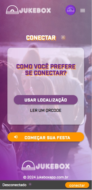 Use a localização para listar jukebox próximas a você e clique em CONECTAR ou aponte a câmera para o QR Code disponibilizado pelo anfitrião.
