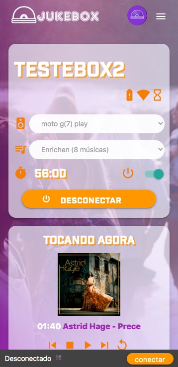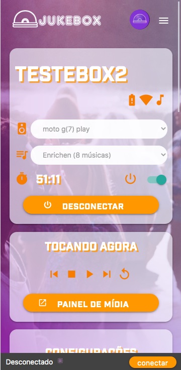 Inicie o Spotify em algum dispositivo, no dashboard, selecione o dispositivo de saída (ex: PC, Tablet) e ligue a chave de energia (Power) no topo. Em alguns instantes a música que está tocando aparecerá no painel e sua Jukebox estará pronta para receber pedidos.
