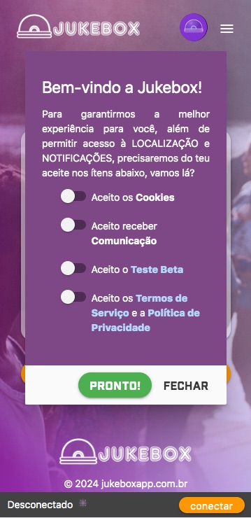 No primeiro login, o sistema exibirá o pop-up "Bem-vindo a Jukebox". É necessário ativar os seletores para Cookies e Termos de Serviço para prosseguir.