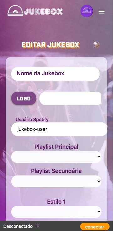 Após a autorização, de volta no aplicativo Jukebox clique em CRIAR SUA JUKEBOX e configure com nome, logo, playlists automáticas e estilos musicais.